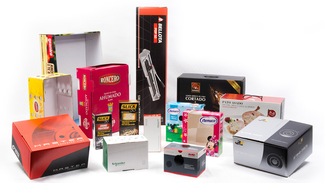 Diferentes modelos de cajas y estuches con asas, ventanas, fondo automático, pegado lineal…con todo tipo de detalles para que su producto se presente en las mejores condiciones.